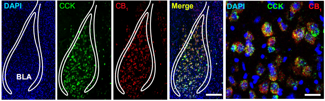 此外,他们利用原位杂交技术发现,大麻素受体大量表达在杏仁核胆囊收缩素肽类神经元阳性的“厌恶”神经环路中。