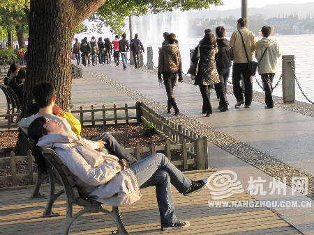 杭州网讯 上周突如其来的寒潮,着实让整个杭州有些措手不及。可寒潮一过,气温的回升速度也着实让人有些措手不及,今天杭州的最高气温更是达到了20.6度,面对这大好阳光,人们纷纷走出室外,享受久违的温暖。 今天下午,杭州网记者来到西湖边,虽然不是周末,但游人却一点也不少,其中不乏头发花白的老年人,许多人是专门出来晒太阳的。 今年已经75的周老伯,住在学士路已经几十年了,今天也专门带着老伴出来晒晒太阳:“前几天,又刮风,又下雨,听说里西湖都结冰了,冻得门都不敢出,这几天天气这么好,怎么还能老窝在屋里呢?”  慵懒,似乎是冬日午后阳光永远的标签,沐浴在这阳光下的人们也显得特别悠闲。在湖滨,几乎所有的长椅上,花坛边上都坐满了人。 女孩儿小宋头枕在男友的大腿上小憩,时不时地撒撒娇,有的游人则索性用外套盖住脸,坐在椅子上小睡一会儿…… 西湖边的游人回来了,可乐坏了西湖边的生意人,西湖上的船夫也显得特别卖力气,船夫老陈说:“上个礼拜的天气可把我们害惨了,我几乎就是休息了一个礼拜,这几天天气好了,我早早地就把船撑出来了。”  前几天,杭州网网友和记者打趣说,对天气最敏感的不是大雁小鸟,也不是花花草草,而是爱美的女孩儿们。今天在西湖边一看,不得不佩服网友对生活细致入微的观察。 这不,刚刚回暖,爱美的女孩儿们就立刻脱下了笨重的冬衣,于是西湖边立刻单衣袭袭,短裙飘飘,好一派江南好春光。 但杭州网记者也提醒爱美的女孩儿们,天有不测风云,毕竟已经到了初冬时节,尽情展示美丽的时候,还是要注意身体,小心别着凉了。 |