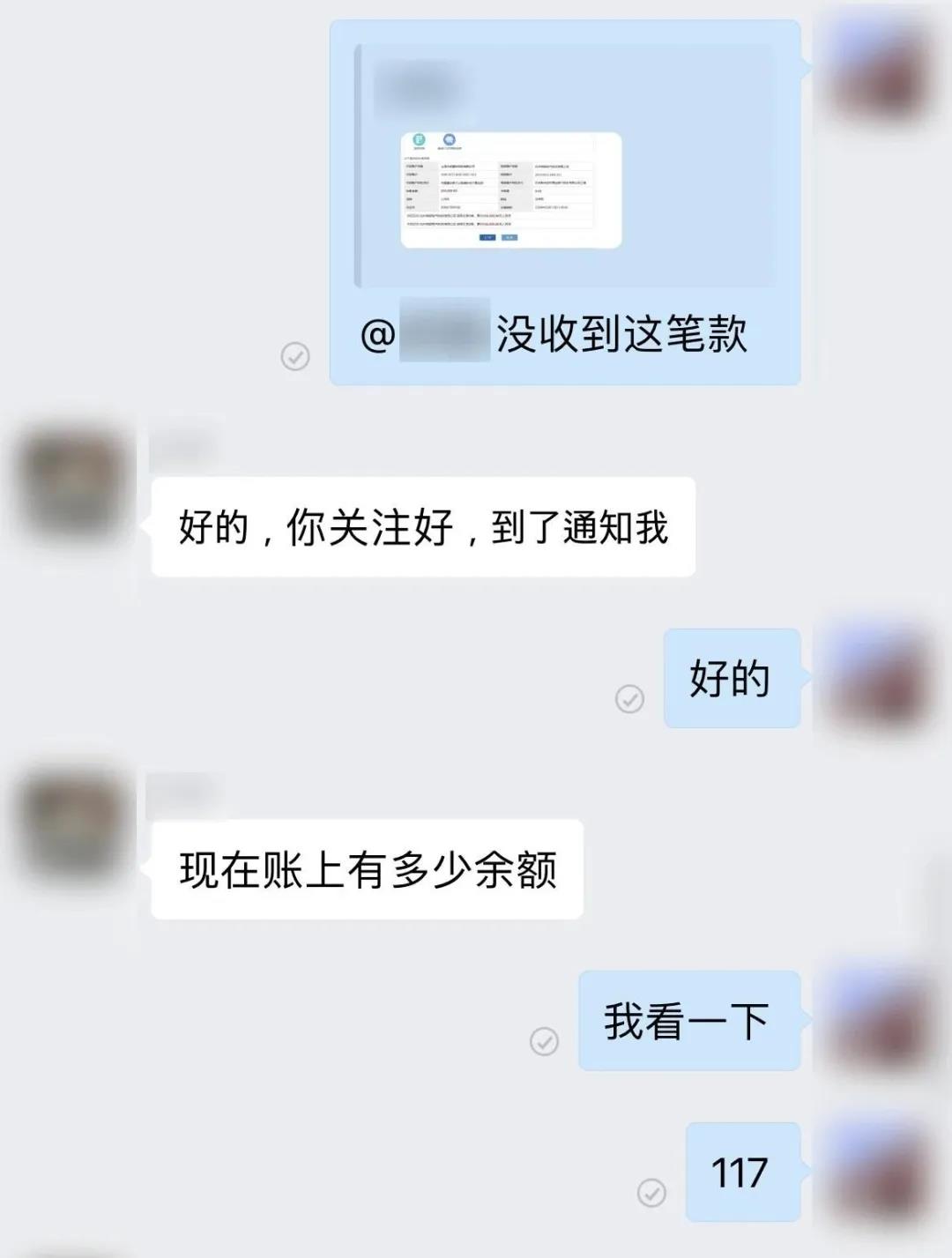进群后,沈女士一眼就看到那个用他们孩子照片做头像的“公司老板”,也就是她“丈夫胡某”。“胡某”先在群里发了一张其他公司发来的汇款记录,让沈女士查一下钱有没有到账,随后问她公司账上有多少余额。这时候,沈女士私信“丈夫”询问要不要把实际余额发在群里,但“丈夫”一直没有回复,反而在群里交代马上用公司账户走个账,付好钱把单子发到群里对接。催促之下,沈女士顾不上那头的私信,直接把95万元转到了一个指定的对公账户。