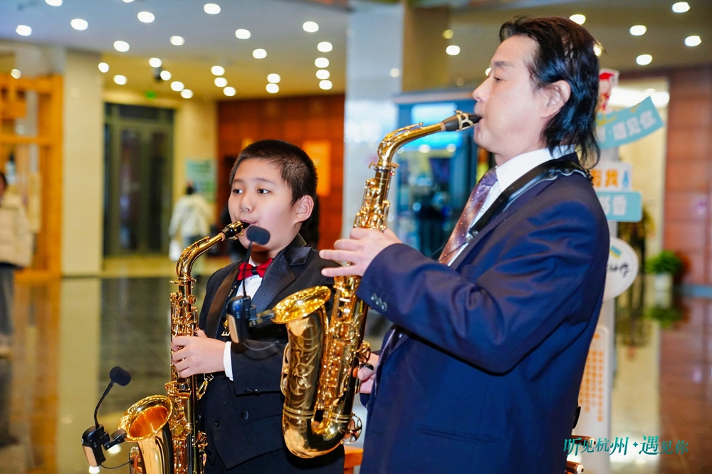 萨克斯表演者李定凯是杭州市萨克斯协会会长,与他一起完成演出的是萧山回澜小学六年级学生龚王釨。他表示:“我有幸在许多不同的舞台上演出过,但杭州图书馆的这个舞台别具一格,这里弥漫着书香,显得格外庄重神圣。因此,当我得知杭州图书馆发布了活动招募信息,便毫不犹豫地带着我的学生报名参加了。”