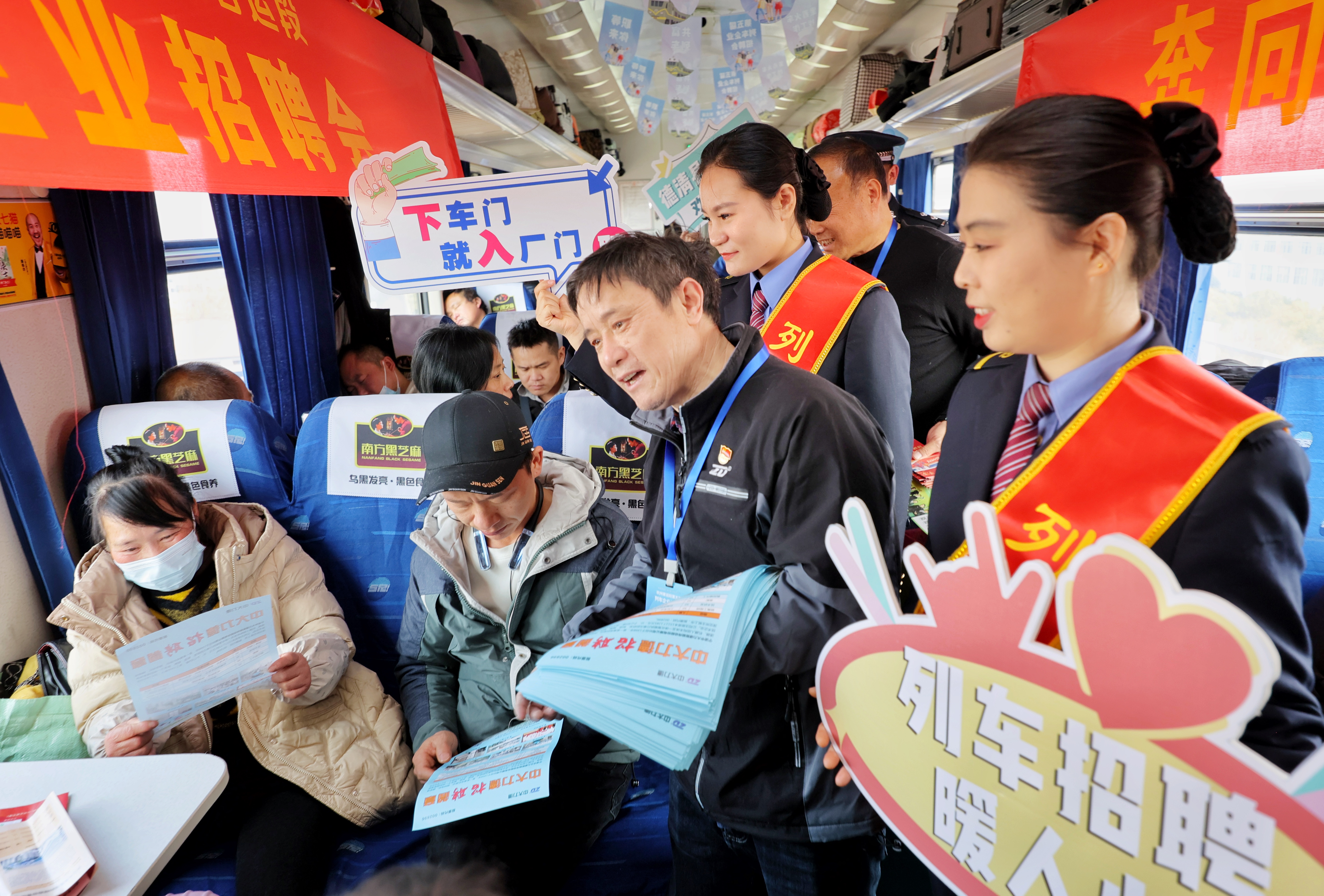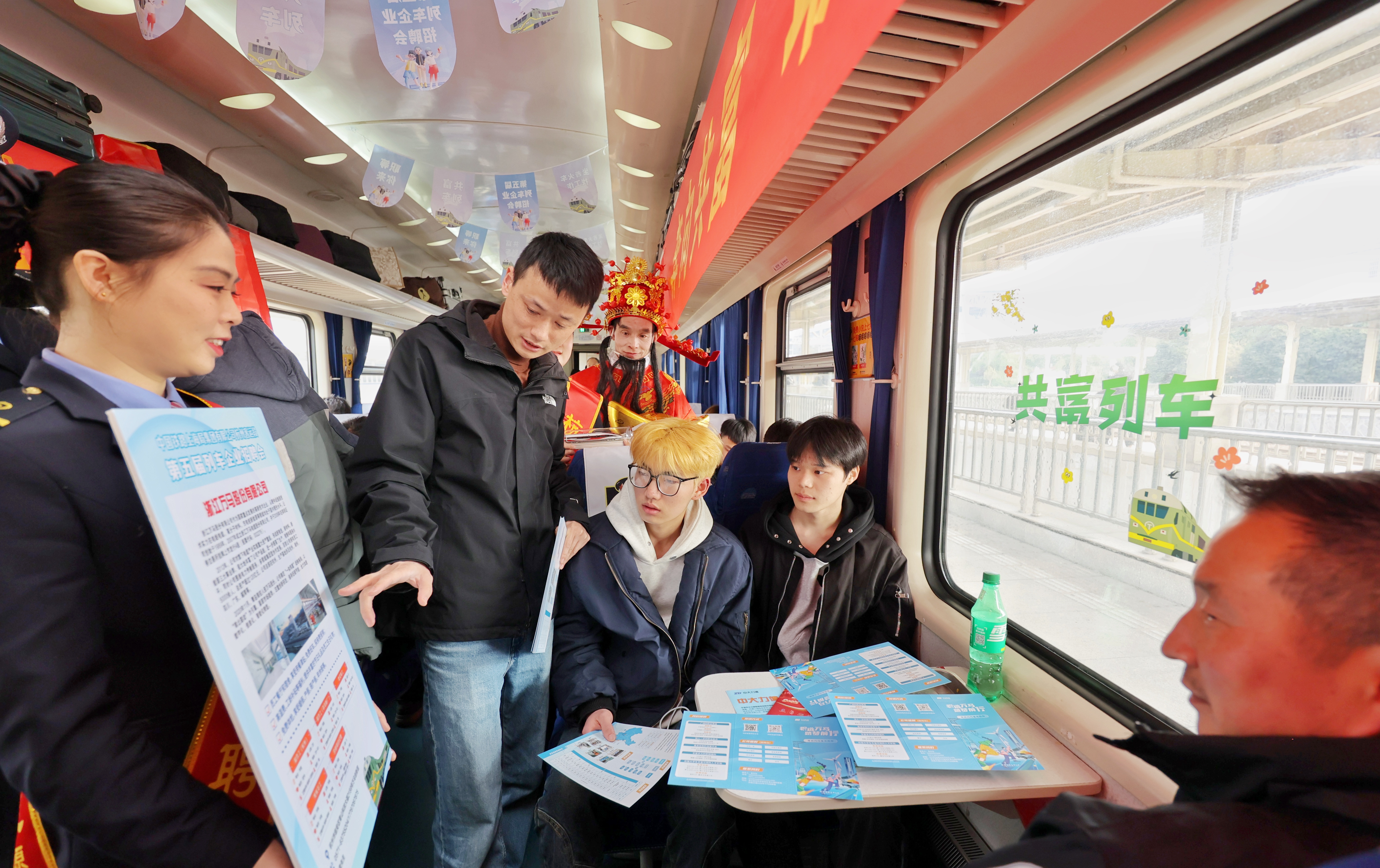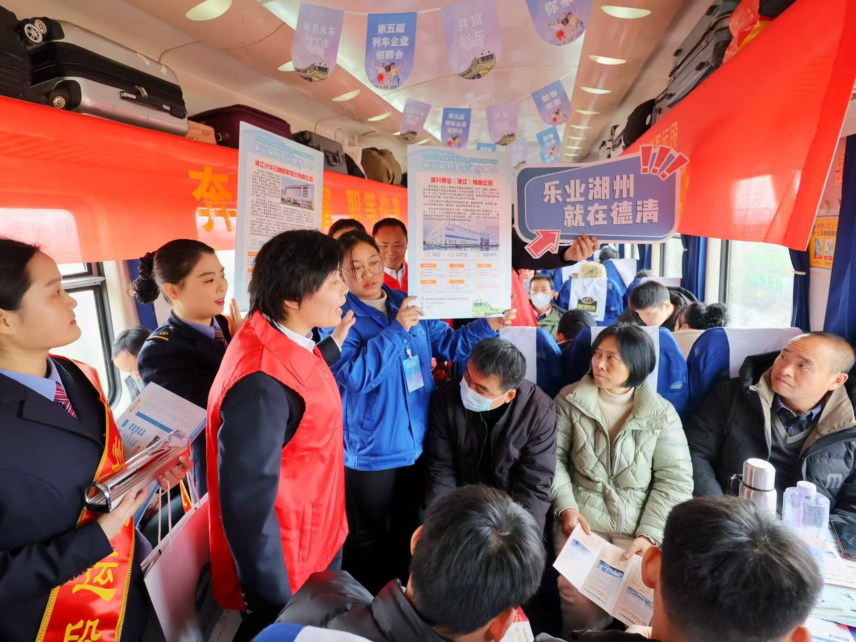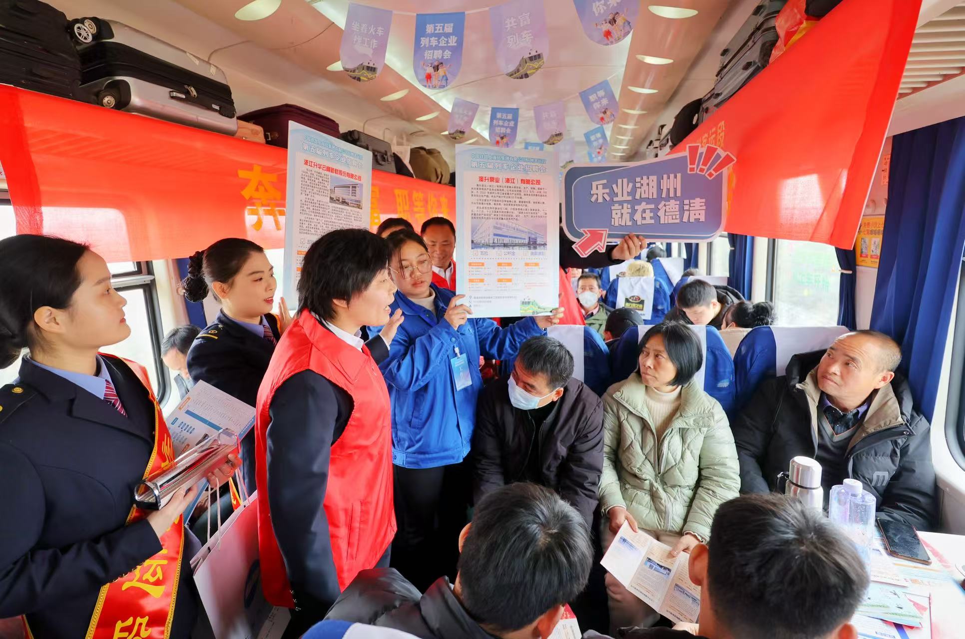 “列车招聘第五年,上千岗位齐登场,列车人才大平台,共同富裕有担当……”随着一阵精彩的快板声,2月13日,杭州客运段第五届列车企业招聘会在广州白云开往宁波的K210次列车上如期举行。