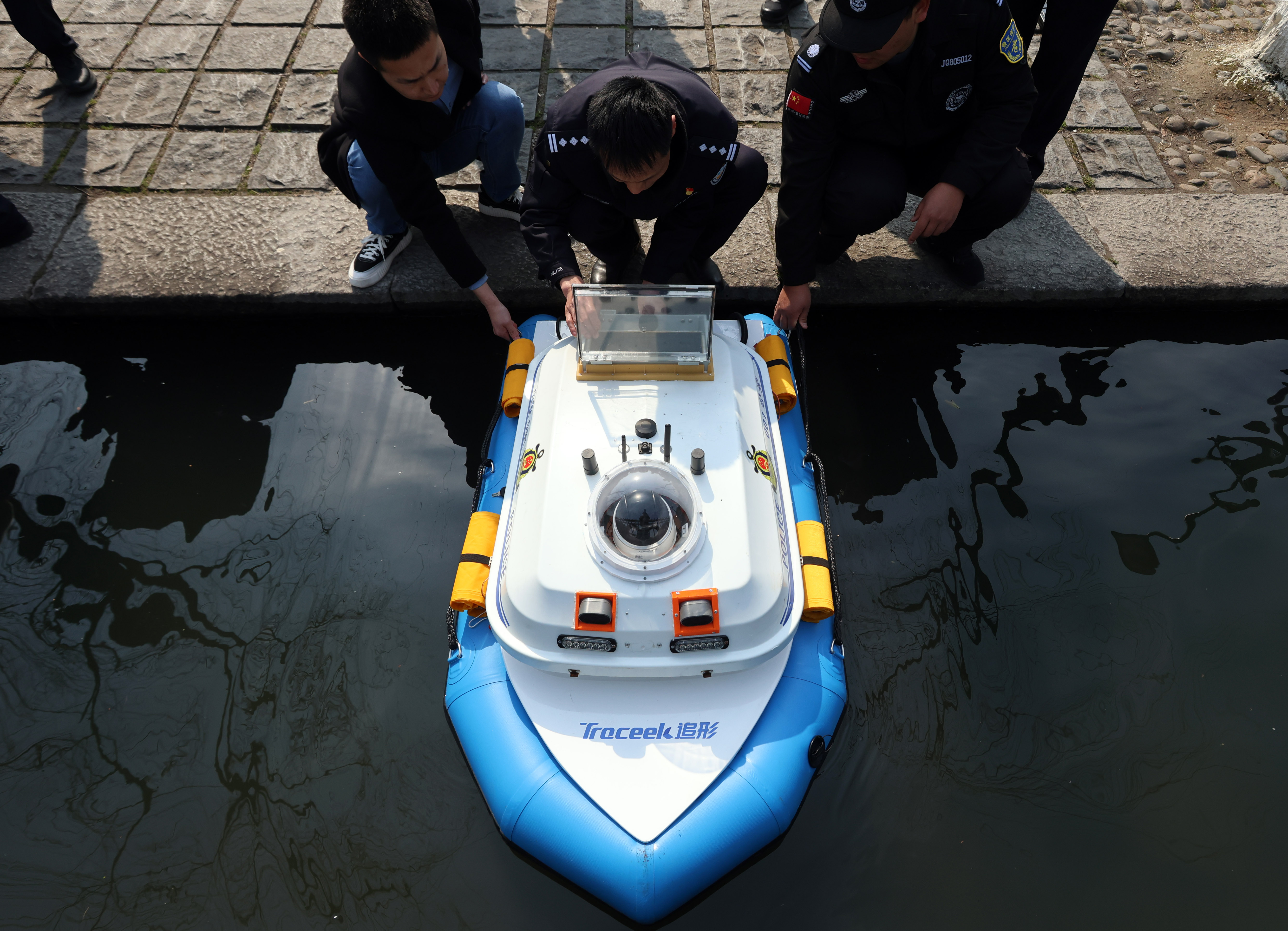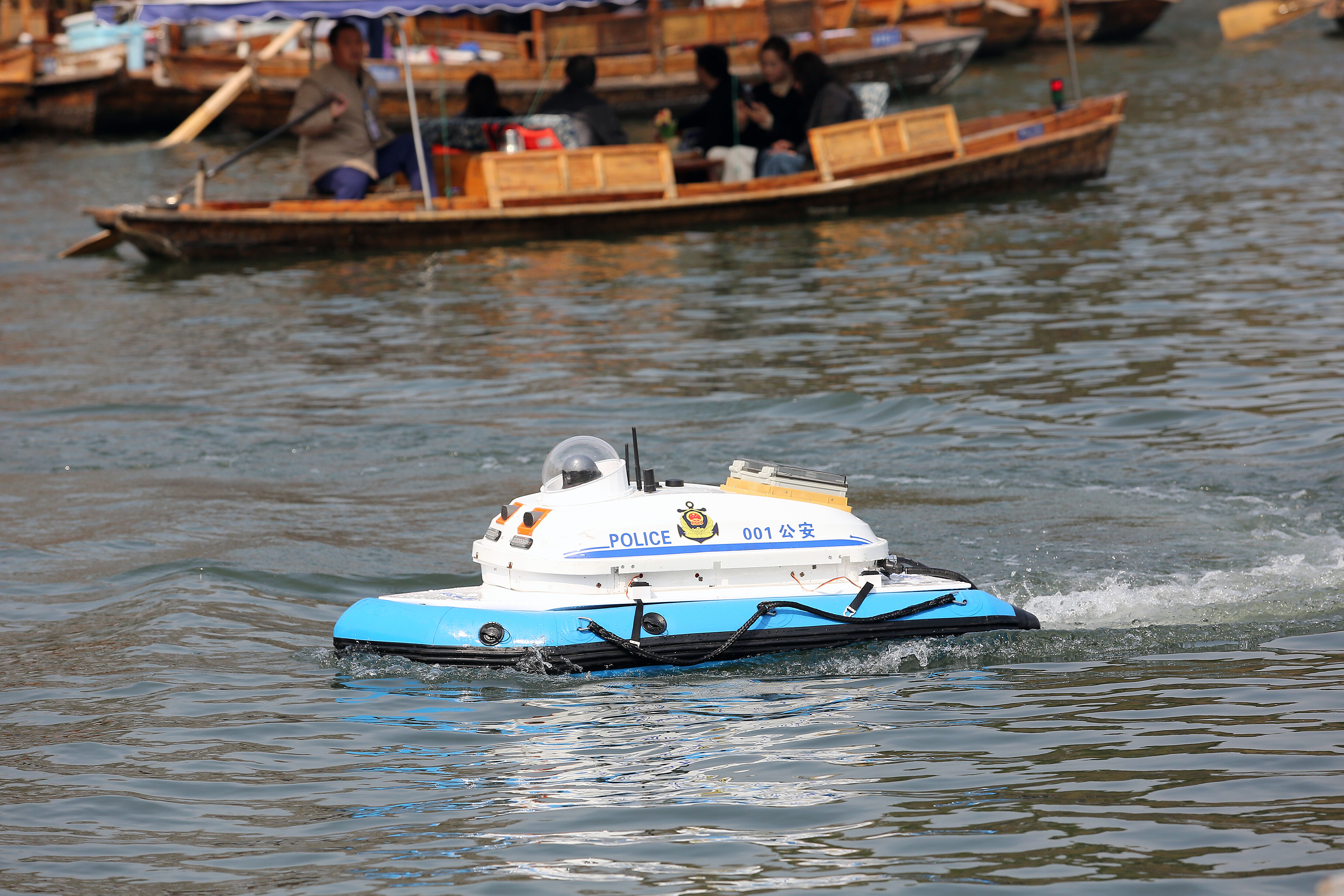 多功能警用无人船则是“水保”智能救捞工具的升级版,船上配备6个救生圈,速度可达20公里/小时,载重55公斤,续航4小时。它不仅具备自动巡航、远程喊话等功能,还能在复杂水域中快速响应,执行救援和巡逻任务。