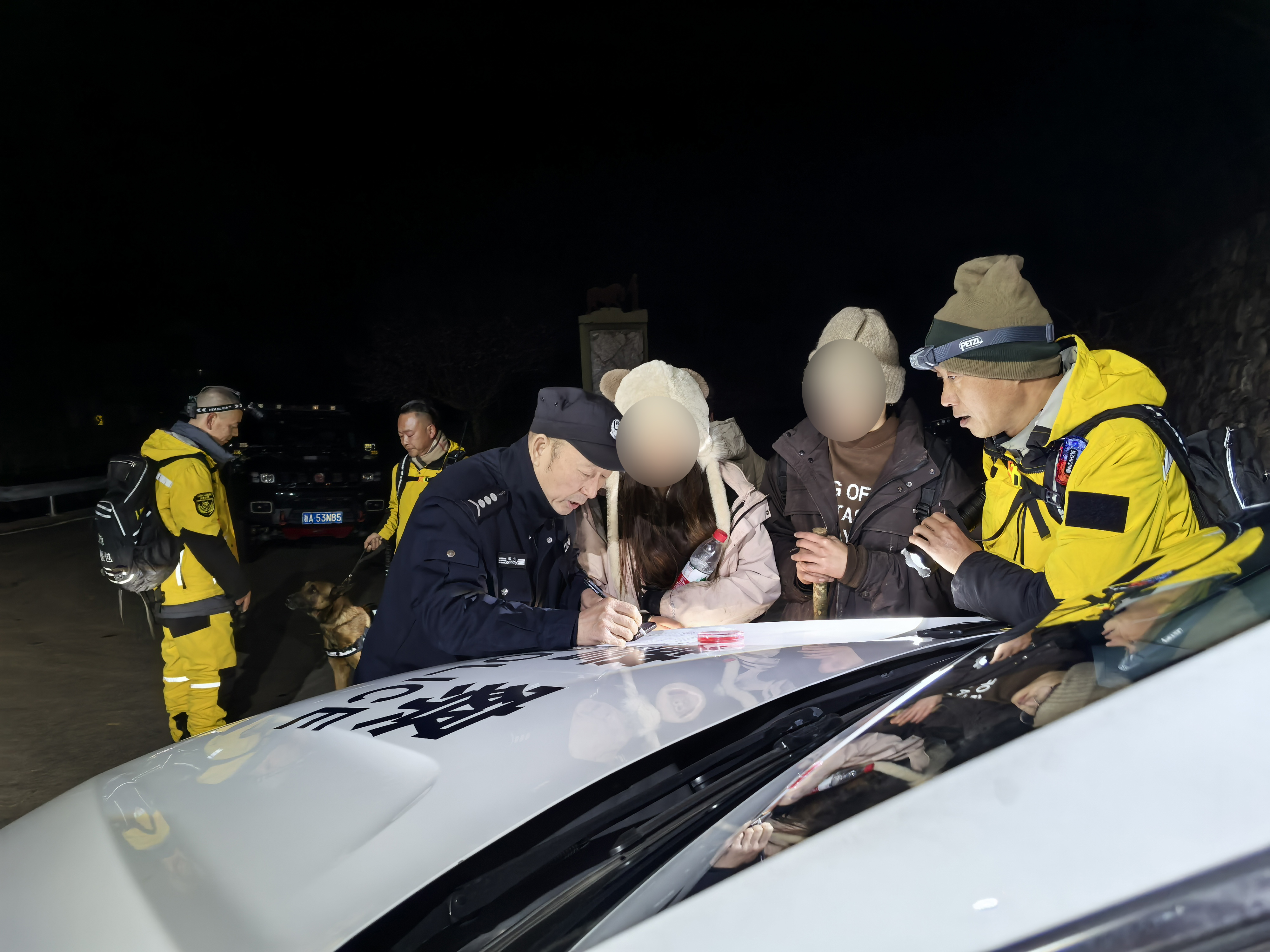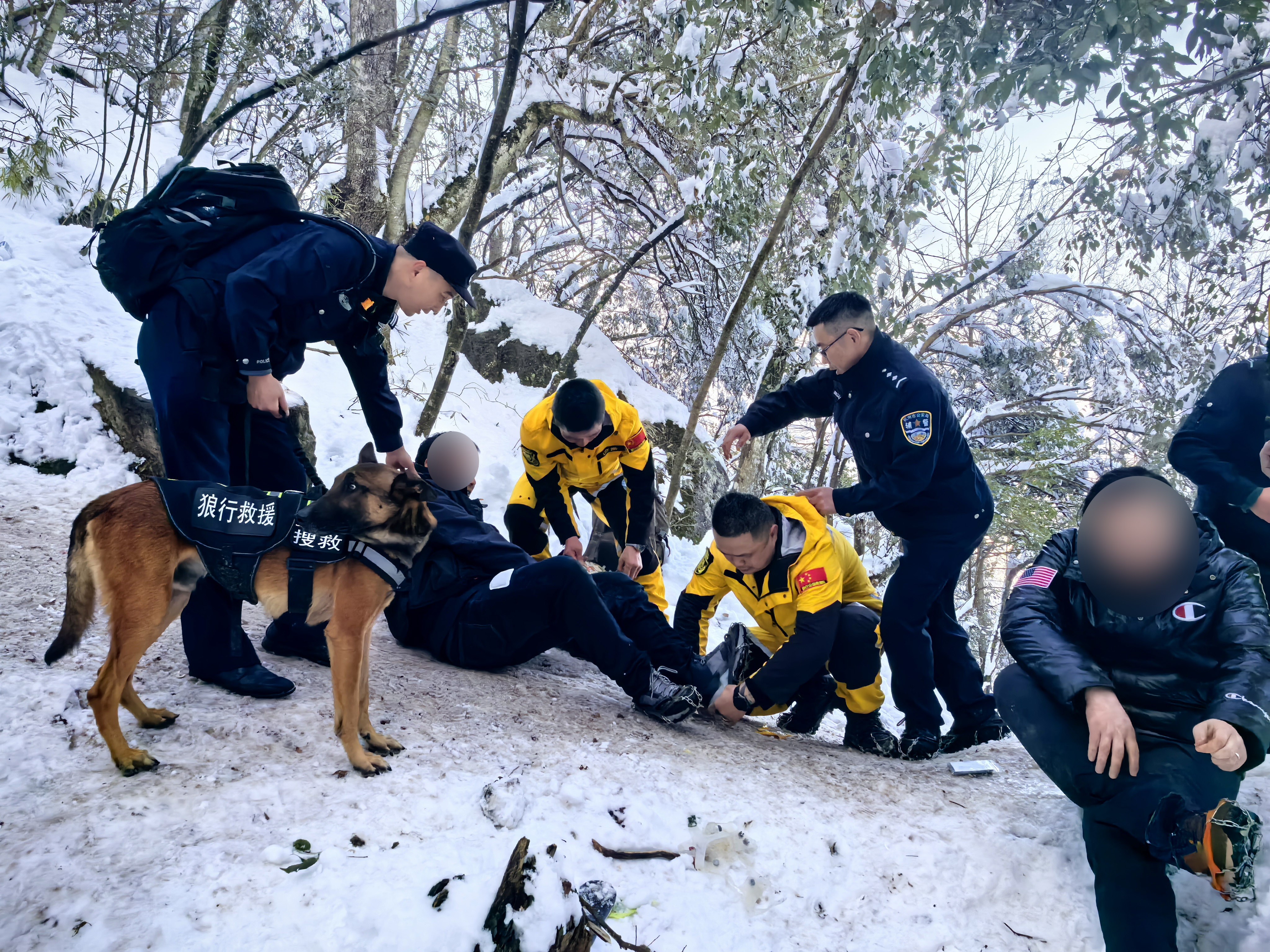 当天18时许,昌化派出所又接到2起报警电话,均是驴友被困百丈岭。梅亮来不及休息再次投入救援行动。这一次,救援队伍更加庞大,同行的不仅有搜救犬“杰克”,还有由昌化派出所、消防、镇村干部、狼行公益救援队等组成的救援人员,大家带上了冰爪、防滑链、急救药品等装备,迅速赶往百丈岭。