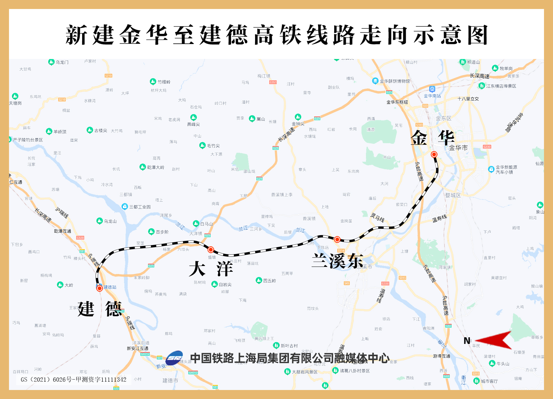 据了解,金建高铁自既有金华站引出,向北经兰溪市、建德市,在建德站接入杭黄高铁,全长64.51公里,设计时速250公里。沿线设金华、兰溪东、大洋、建德等4座车站,其中兰溪东站和大洋站为新建车站。