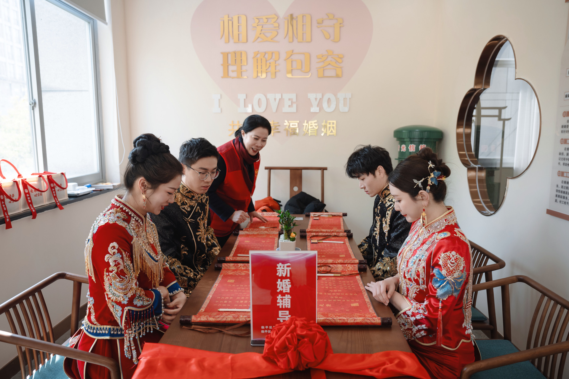 升级改造后的婚姻登记处以“一站式服务+沉浸式体验”为核心设计理念,不仅设有婚俗文化展厅,生动展现了中国婚俗文化的演变历程和江南水乡特色婚礼习俗,更精心设计了中西式领证场景,让新人在传统与现代之间自由切换,感受不同风格的浪漫与甜蜜。同时,婚姻登记处还整合了婚前体检服务,为新人提供了一站式婚姻服务新模式,极大地提升了服务效率和便捷性。
