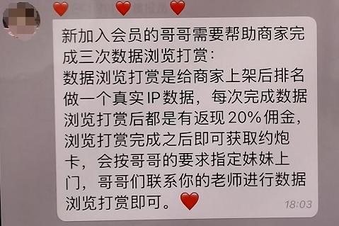 3月初,小李浏览网页时发现了一个可以与美女“约爱”的网站,随后添加网站客服QQ进入多个群聊,又在对方引导下下载安装了几款陌生App。注册后,“客服”向其介绍平台可帮助其找到心仪美女线下约会,只要为美女完成打榜任务就能免费约,每单任务还能获得20%返现收益。另一边,交流群中也不时有人分享自己的成功经验,看着那些让人面红耳赤的内容,小李很是心动。一段时间观察后,小李实在心痒难耐,终于联系上“客服”想要约到一位心仪的姑娘。很快,他在众多美女照片中选出了自己中意的,随后跟随“约爱导师”开启了所谓的助力任务。几项简单任务操作完成后,“导师”向小李开启了终极任务,为选定美女打榜助力,只要美女冲榜成功,他便可免费约到对方。