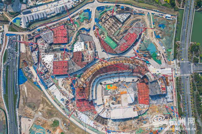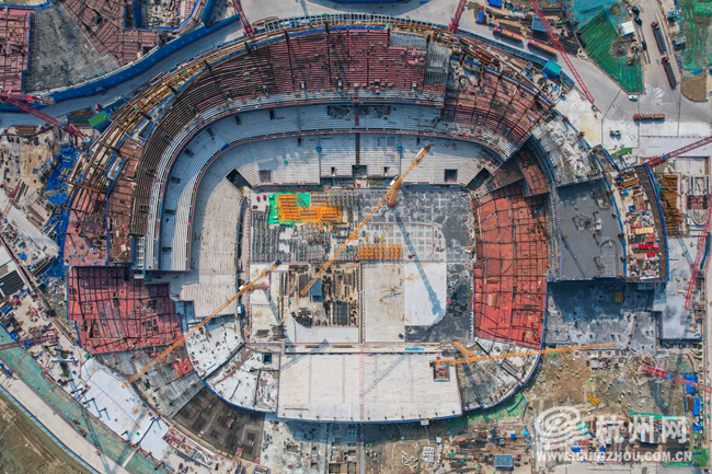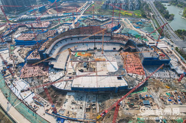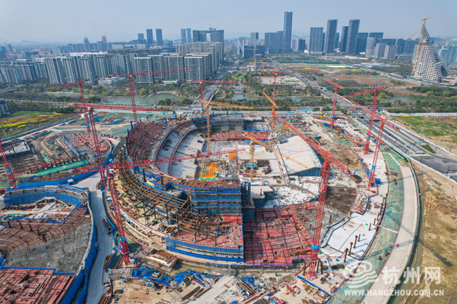3月19日,杭州余杭区国际体育中心建设现场一片繁忙,工程正稳步推进,其中备受瞩目的6万座专业足球场首块主体结构封顶,足球场轮廓已初步显现,整个项目预计2027年完工并投入使用。