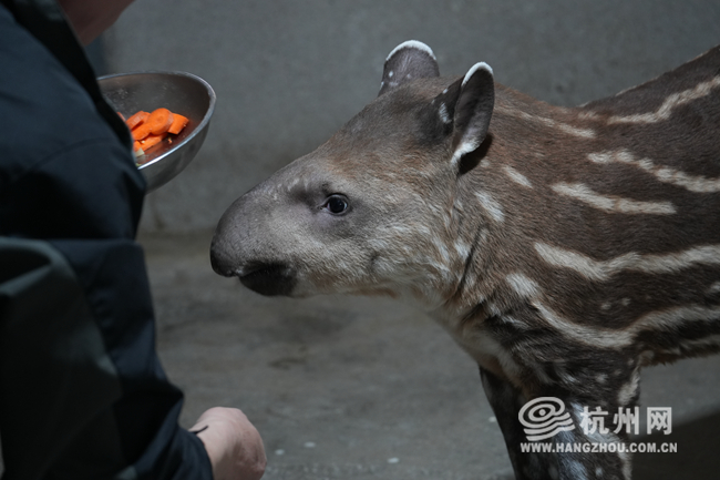 保育员说,随着貘宝宝逐渐长大,除了日常吸食母乳外,他们会在貘宝宝的饮食上逐渐增加苹果、胡萝卜及树叶等辅食,以补充貘宝宝成长所需的各类营养物质,增加其进食食物的丰富性,同时也是为它长大后的独立进食做准备。