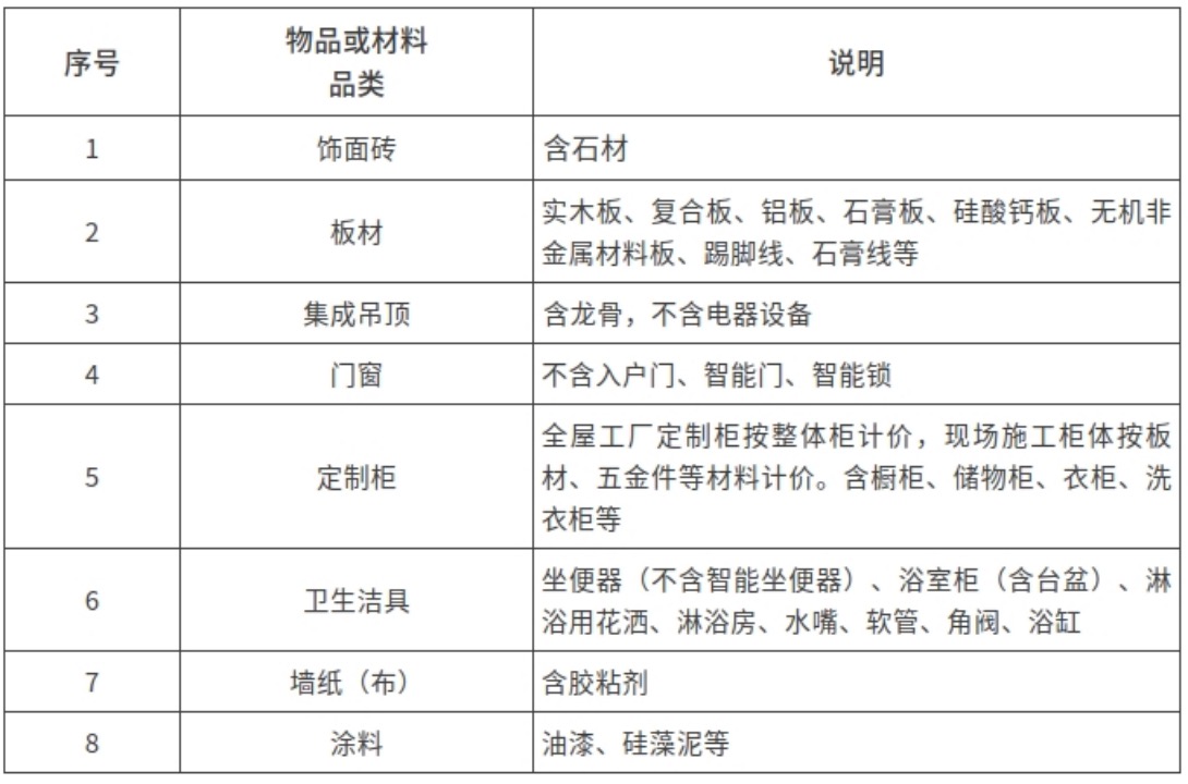 补贴的物品和材料包括饰面砖、板材、集成吊顶、门窗、定制柜、卫生洁具、墙纸(布)、涂料等8大类。补贴额度按照可补贴品类的实际购买价格的15%计算,每位消费者且每套房最多可补贴1次,不超过2万元。