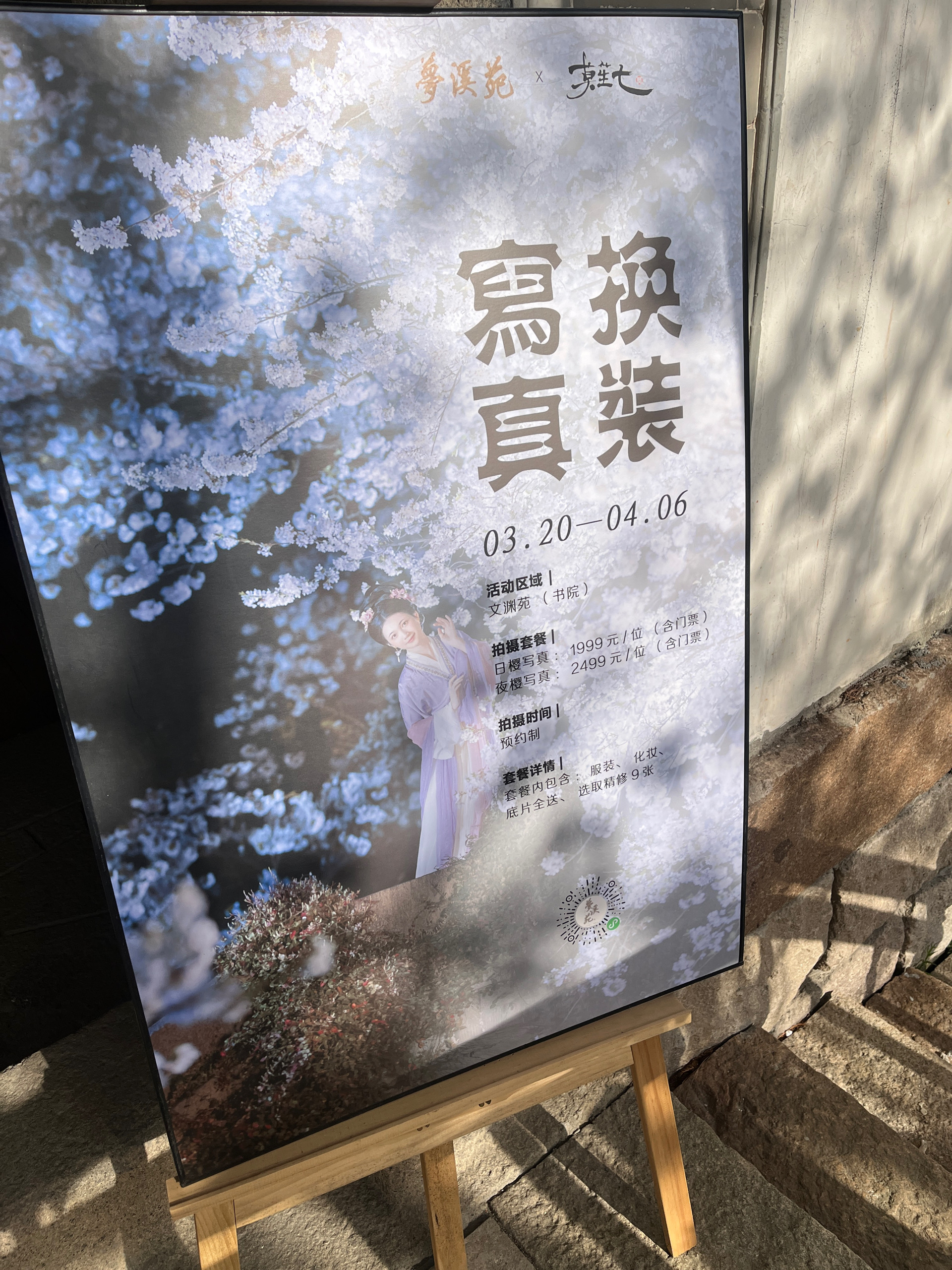 在梦溪苑内,还有一家古风换装写真工作室。海报显示,日樱写真为1999元,夜樱写真为2499元。