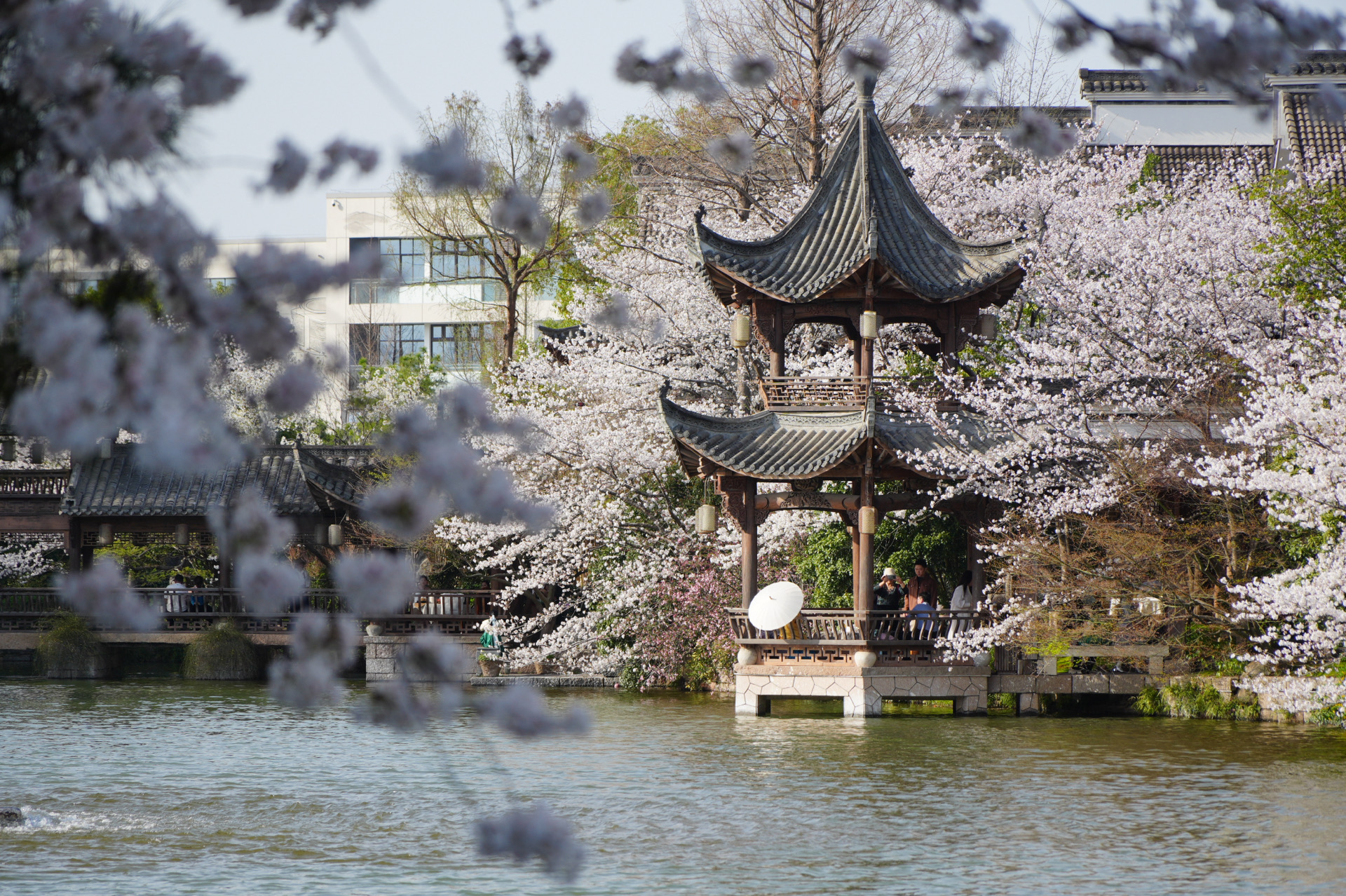 樱花树下,两个年轻男生正在湖边拉着小提琴。西洋乐器奏响国风的曲子,在中式的园林里悠扬婉转。