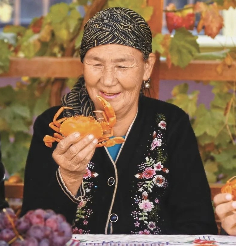 在阿拉尔市托喀依乡喀尔墩村,67岁的村民阿依斯汗·艾则孜第一次吃上青蟹,倍感新奇