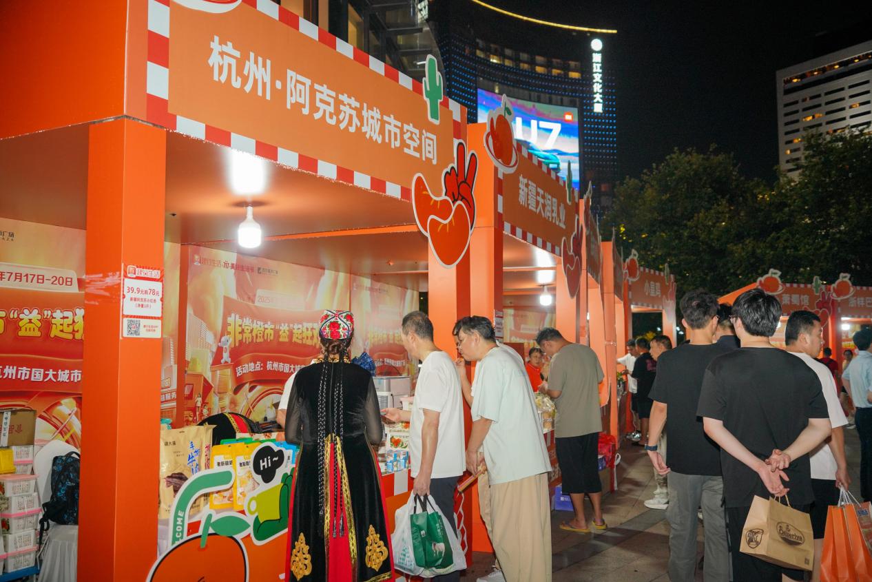 7月17日晚,国大城市广场的灯光染上暖橙色。来自阿克苏、柴达木、甘孜的农副产品特卖摊前,一场以“橙”为媒、以“善”为约的公益消费盛宴,就成了杭城夏夜最热闹的“共富舞台”。