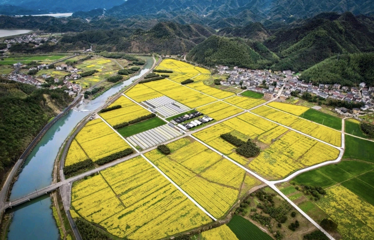 作为全国最大的蜂产品加工出口基地,桐庐不仅有蜂产品孵化中心、检测中心、实验蜂场,更在分水镇上藏着个“蜜蜂友好村”。每到8月底稻田抽穗时,300万只蜜蜂从蜂箱里“涌”出,在千亩稻田间自在采蜜,构成一幅生动的“蜂稻共生”图。这样的场景,在油菜花开的季节,也能看见。