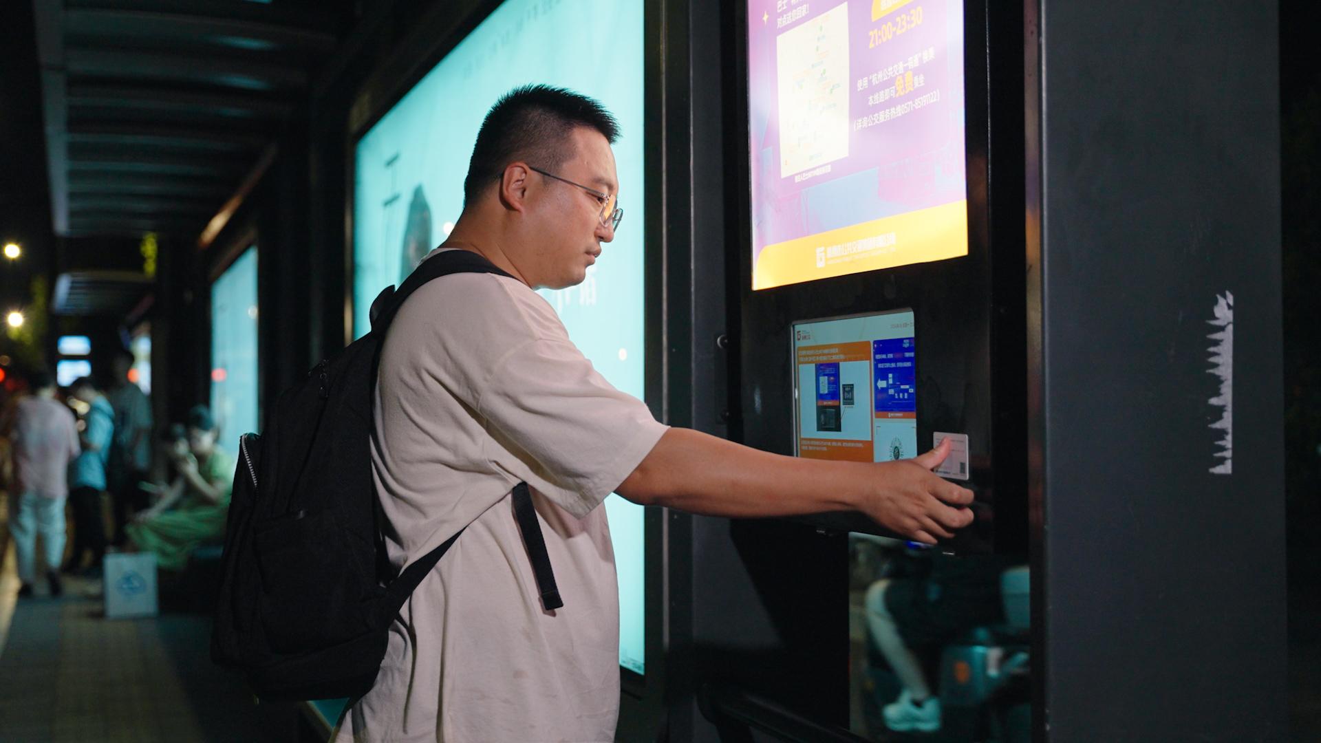 除了核心接驳服务,杭州公交还同步升级配套设施。从地铁九和路站A口出站西行40米,便是专为夜间乘客打造的“夜归候车室”。虽空间紧凑,但功能设计贴合夜间出行场景:发车预告屏实时滚动显示车辆到站时间与行驶状态,让候车进度一目了然;舒适的座椅可供加班市民短暂休憩;遇雨天时,室内爱心雨伞可随时取用,角落摆放的信息宣传折页则方便乘客了解线路详情,一盏暖灯照亮了深夜等待的时光。
