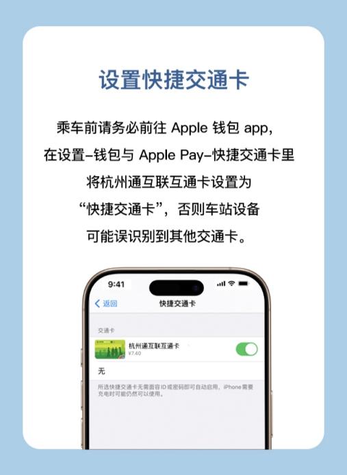 用户可在“和包”app首页进入“出行”板块,选择杭州通互联互通卡,按页面提示操作即可完成开通。也可直接在Apple钱包中选择杭州通互联互通卡进行添加。