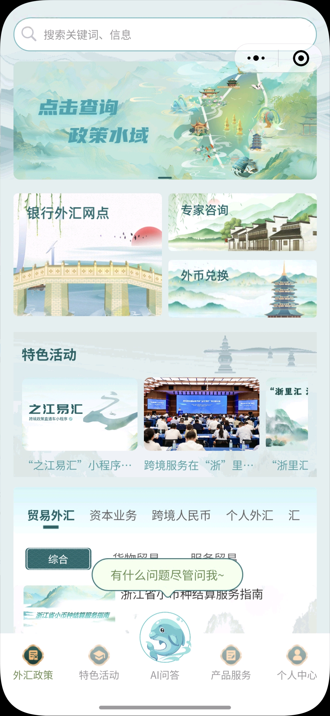 作为专为涉外企业设计的综合服务平台,“之江易汇”涵盖政策介绍、业务咨询、网点导航、产品服务、特色活动五大核心板块。在这里,最新的外汇与跨境人民币政策、最近的外汇业务网点、最权威的外汇专家解答,以及银行跨境特色产品、跨境企业优秀案例,都能随取随用,实现“一站式”跨境服务。