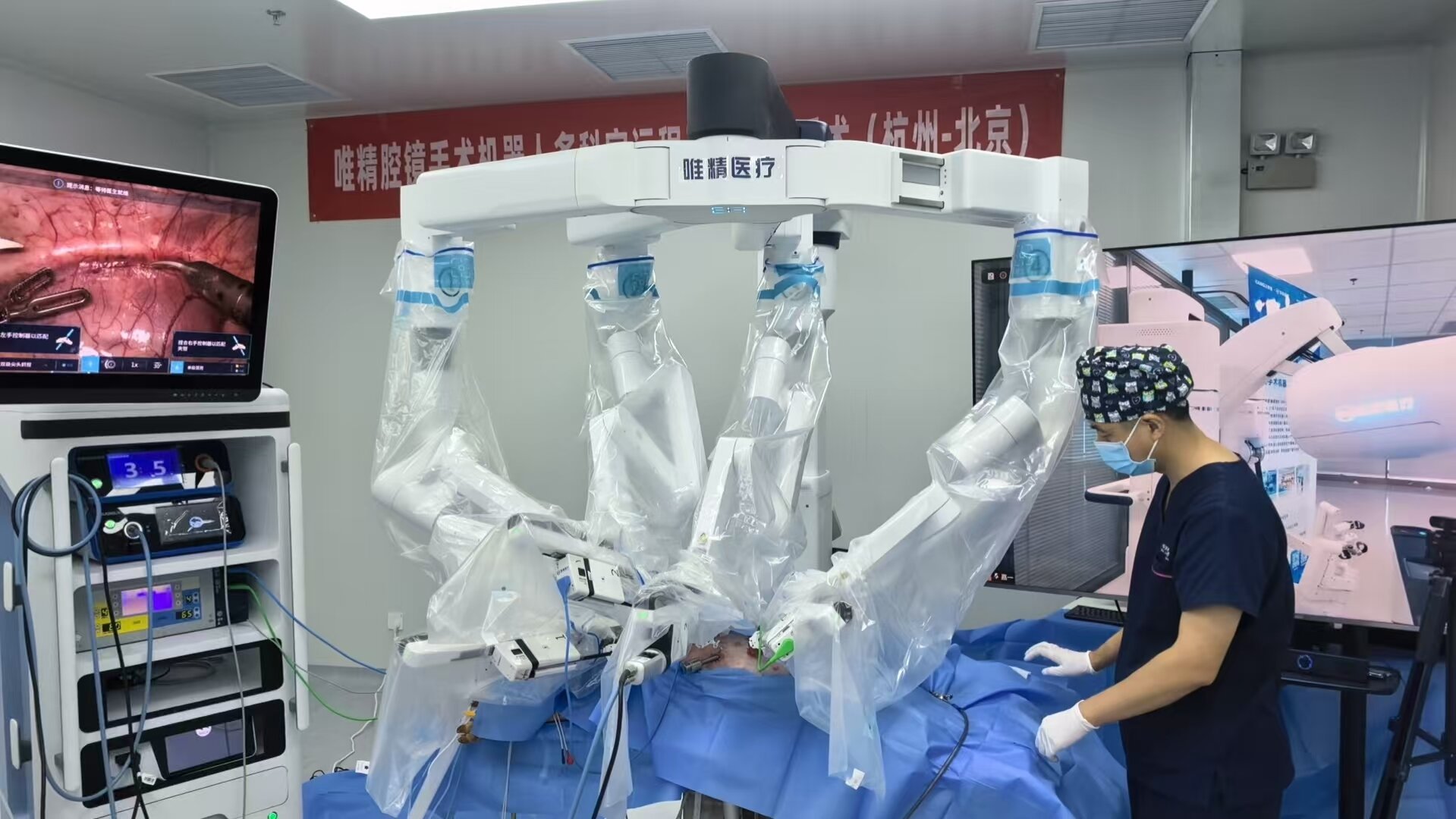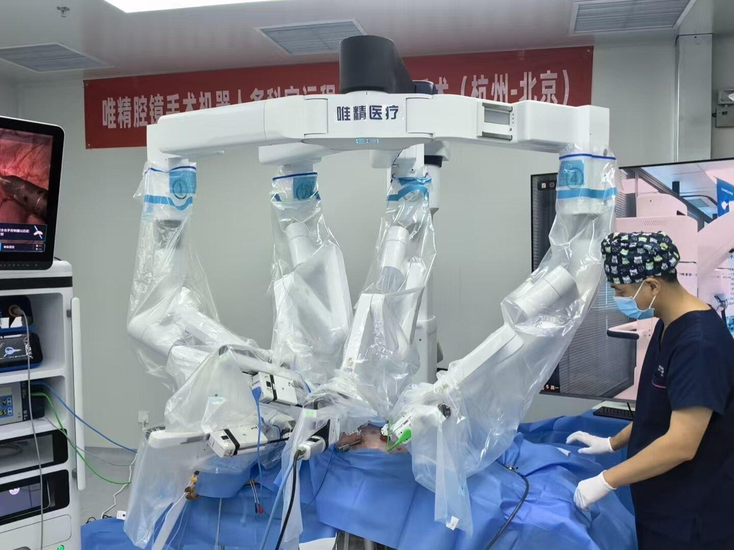 切除范围规划、术中止血、组织离断及创面清理缝合……多学科专家通过唯精四臂腔镜手术机器人系统,完成了一场跨省连台动物远程手术。