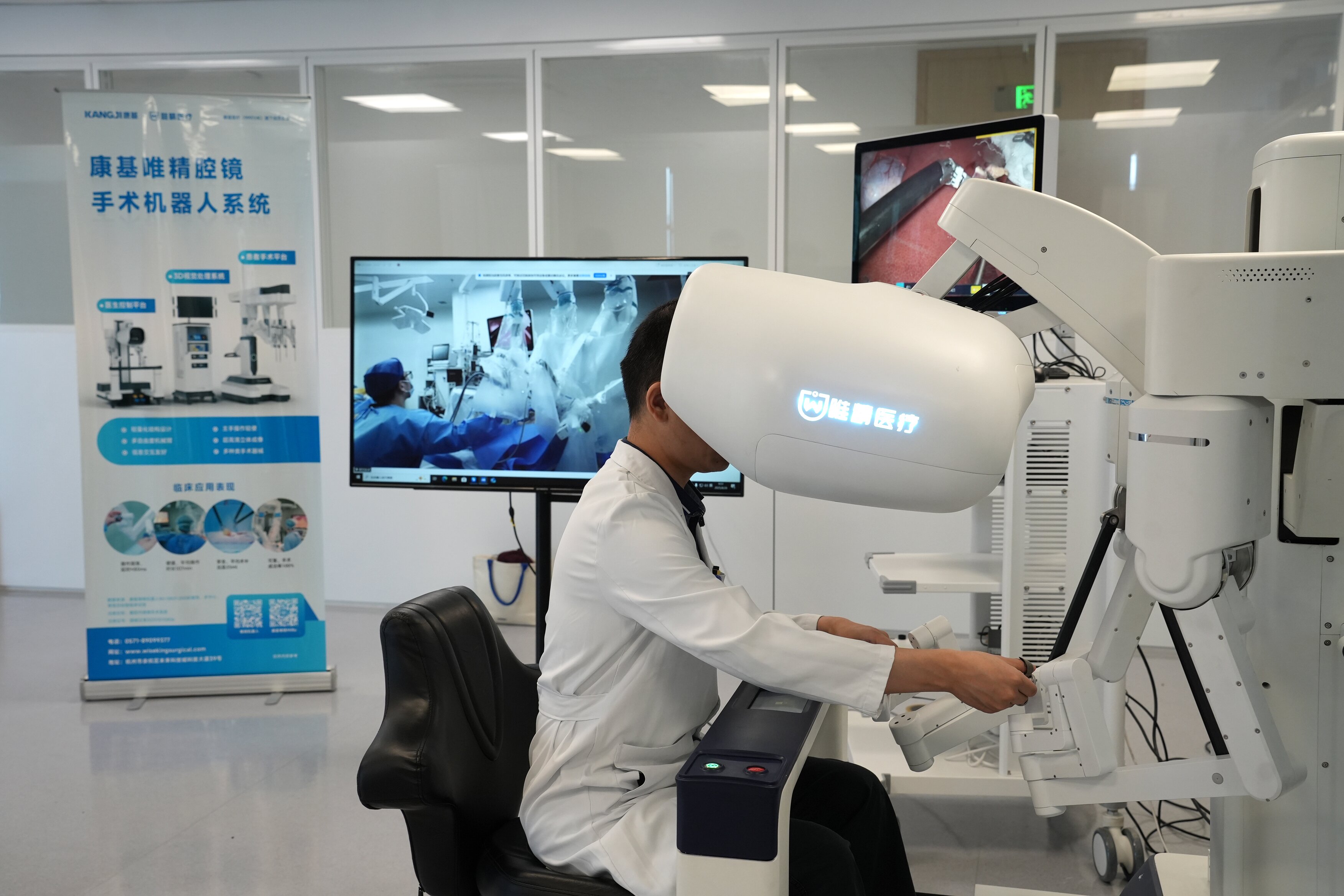 与常见手术不同,这里没有无影灯下密集的身影,也没有护士频繁传递器械的忙碌,四只机械手臂在医护人员的注视下实施手术。而此时此刻,主刀医生却坐在1200公里外的浙江大学医学院附属邵逸夫医院,注视着沉浸式影像屏幕,手握控制柄完成着每一步操作。