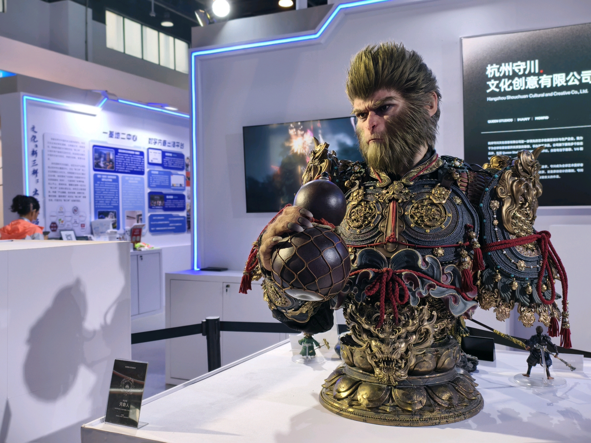 在余杭展区,文化的创新表达形式多样,展现出强大的产业活力。杭州守川文化创意有限公司的展位前,一款《黑神话:悟空》天命人1:1半身像霸气十足。植发、硅胶肌肤、精细的铠甲还原,极致的工艺细节令手办收藏爱好者们流连忘返。另一边,浙江梦巴格地理文化发展有限公司则带来了“史前萌兽”和“萌仔茶话会”系列动物模型,栩栩如生的剑龙、俏皮的小熊猫,为展区增添了不少童趣与生机,实现了“把自然带回家”的温馨愿景。