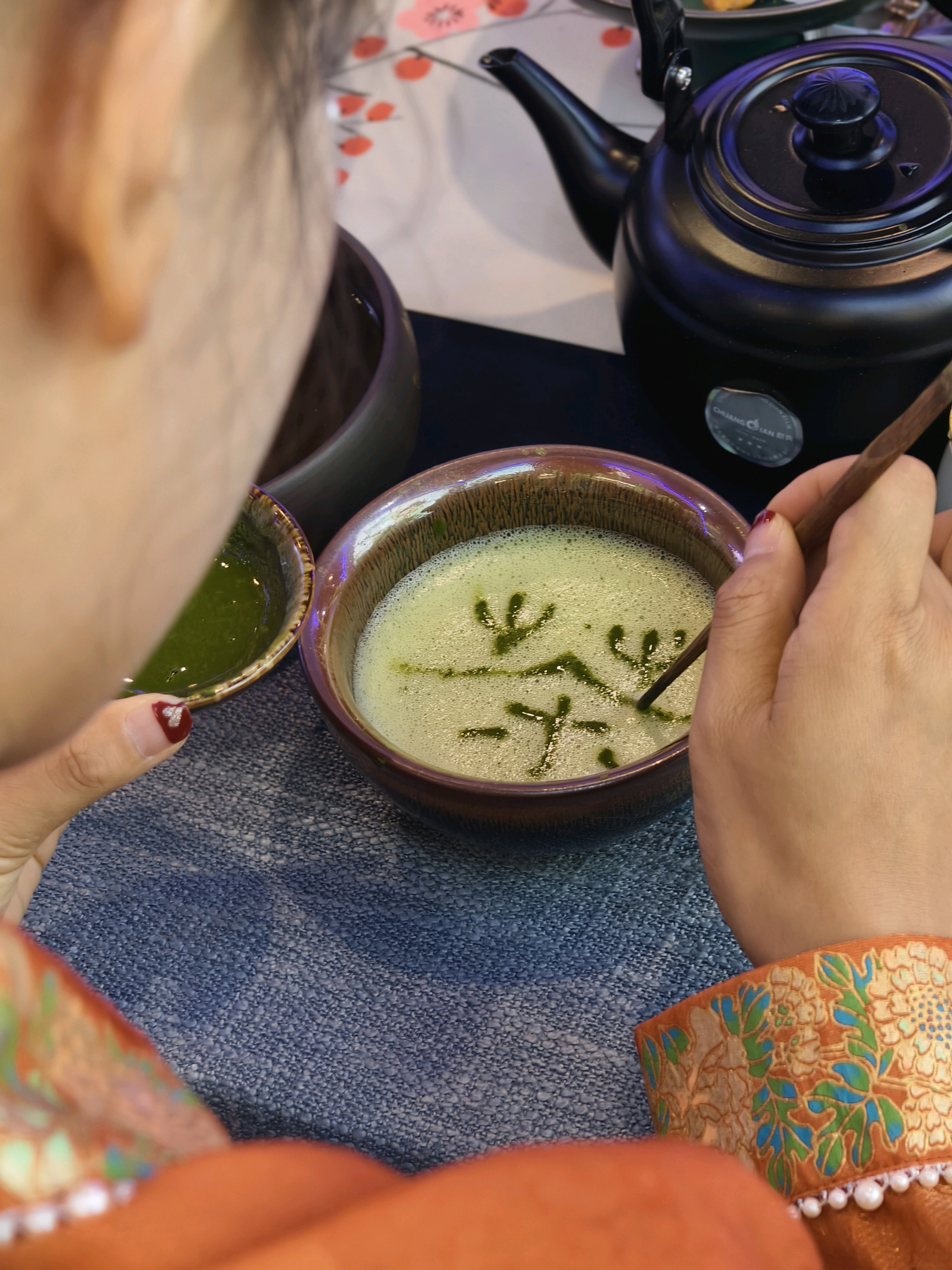 如果说科技感是余杭展区的“骨架”,那么深厚的文化底蕴则是其“血肉”。在“径山点茶互动体验区”,茶礼师正优雅地演示着宋代“七汤点茶法”,茶筅击拂,沫饽渐起,引来不少观众驻足。更吸引人的是,观众可以亲自上手,在指导下尝试点茶、作画,体验一把宋人的风雅。