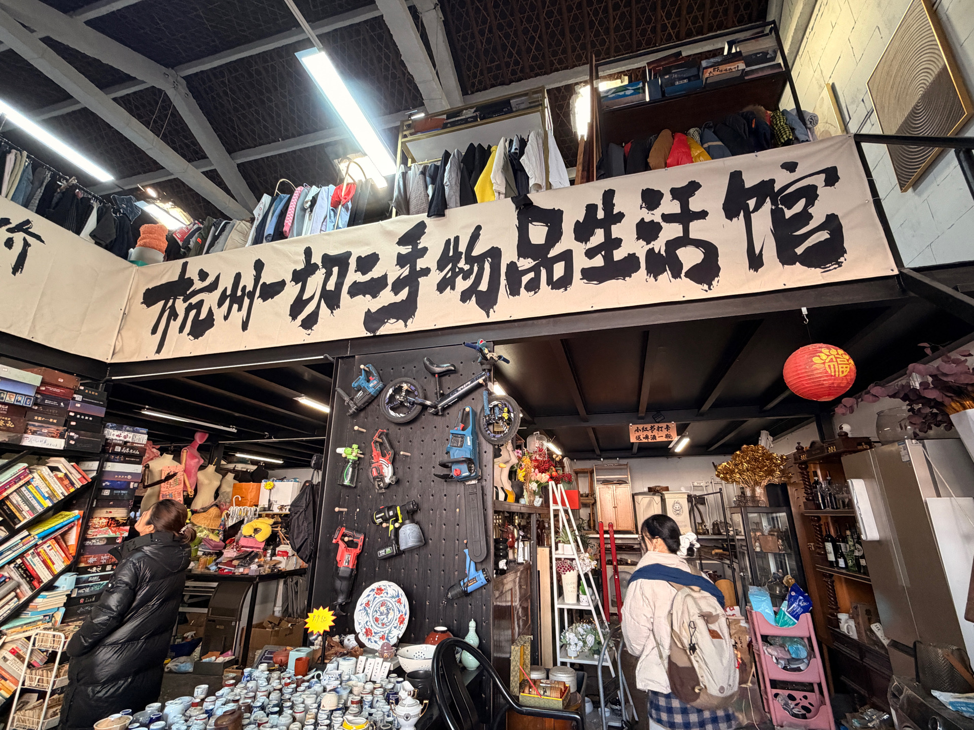 在萧山一处由老厂房改造的文创园里,藏着一座不起眼的二手仓库,没有醒目的招牌,只有黑漆手写的店名“爬”在一二楼之间的墙上。
