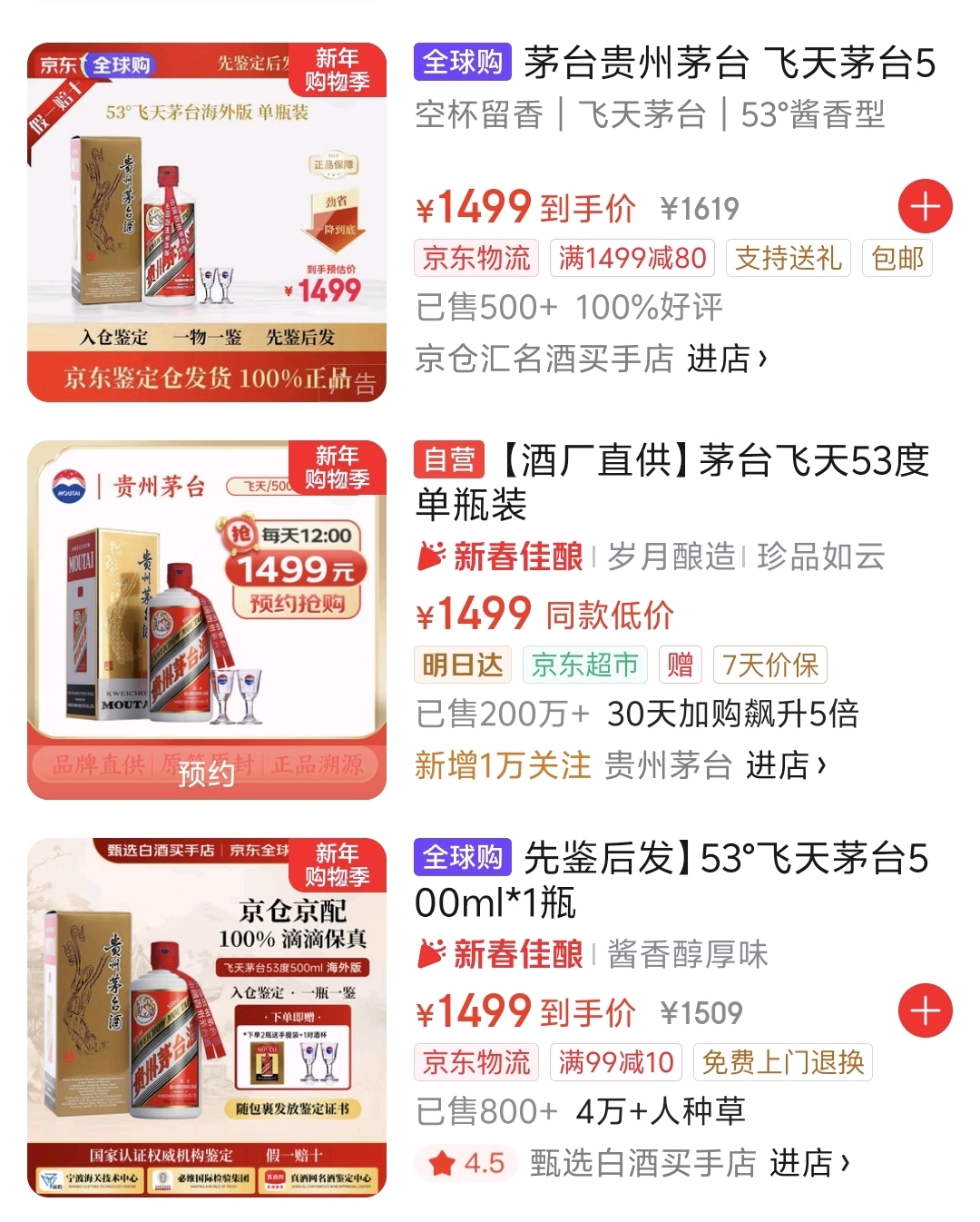 反观线上平台,价格已基本趋于稳定。截至发稿前,在淘宝、京东平台,售价1499元的2026飞天茅台依旧库存充足,不过,多数经销商店铺单瓶价格在1600-1700元区间。