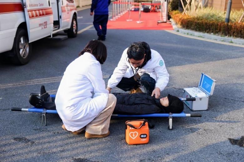 人员救援坚持“自救与施救相结合”:一方面引导被困人员使用逃生缓降器有序撤离;另一方面调集云梯救援车,对高层受困人员实施高空转运,确保全员安全。最后,现场医护人员立即对伤员进行初步检查和急救处理,并将其抬上救护车。