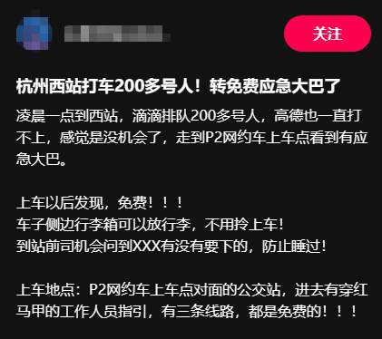 “凌晨一点到西站,滴滴排队200多号人,高德也一直打不上,感觉是没机会了,走到P2网约车上车点看到有应急大巴。”近日,不少网友在小红书、微博发布动态,文字里满是网友对杭州西站暖巴、应急巴士的好评。