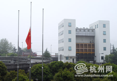 杭州师范大学图书馆前升国旗下半旗,向青海玉树地震遇难同胞致以深切哀悼。(记者 陈焕 通讯员 叶波 摄)
