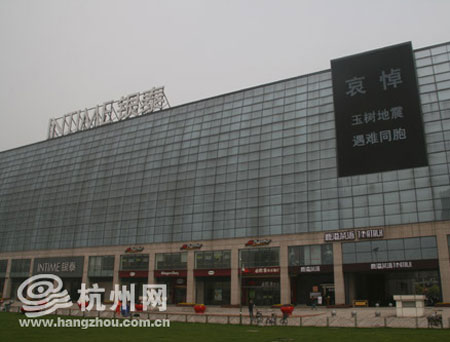 庆春广场上的“银泰”黑色大屏幕打出了哀悼玉树地震遇难同胞。(实习生 陈少思)