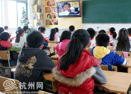 杭州育才第一实验学校4(3)班组织观看玉树地震灾区节目。(实习生 蓝震)