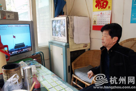 花园社区项师傅时刻关注玉树地震灾区震情。(实习生 蓝震)