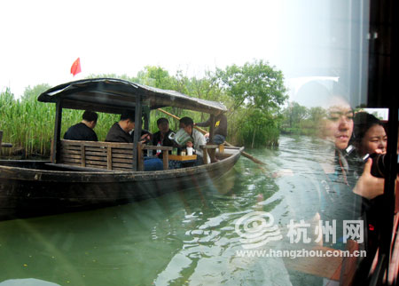行船在西溪湿地,时有白鹭从水面掠过,这里平静的气氛,令网络记者们赞赏不已。