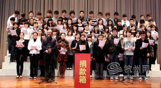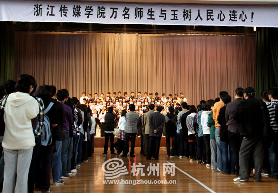 “这一刻,遥远的玉树就是我们被灼伤的心。疼痛的感觉,直下海拔三千米,窒息着这个春天,每个人的呼吸。你的伤就是我们的痛,你的痛就是我们的泪滴,我多难兴邦的民族啊,我幅员辽阔的中华大地,从来就是生命相托,骨肉相连的整体……”4月21日下午,浙江传媒学院体育馆里萦绕师生深情的朗诵声。