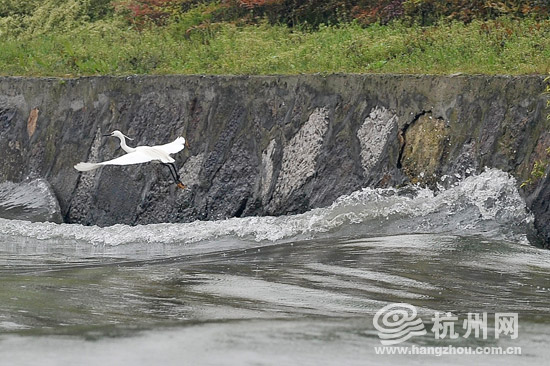 摄影家们搭乘运河漕舫沿运河采风,船只激起的波浪惊起岸边的一只水鸟。
