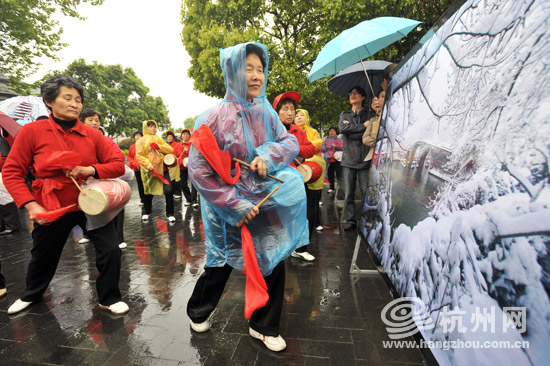 在一幅拱宸桥雪景的照片前,社区居民在表演欢快的腰鼓。