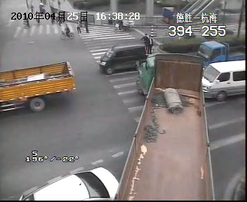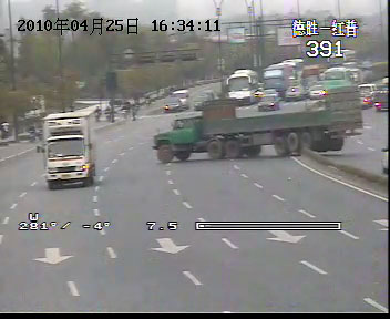 16时32分许,货车通过德胜路红普路口。小江驾车和另一辆警车尾随在后,不停用警报和喊话的方式警告司机停车检查。但司机驾驶货车曲线行驶故意阻止警车靠近。