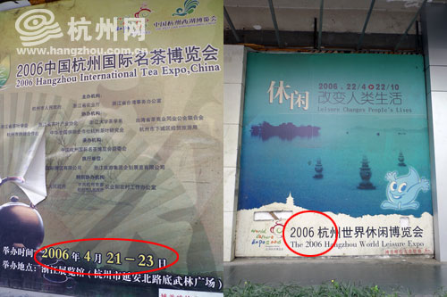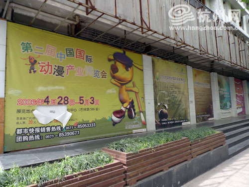 在凤起路333号附近,杭州网记者看到了6张大幅招贴广告,分别为两张2006年杭州世界休闲博览会的广告,两张2006杭州国际名茶博览会的广告以及一张2006年、一张2007年动漫节的广告。广告上的时间大部分为2006年和2007年的宣传内容。