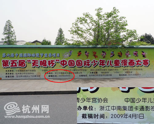 第五届“天眼杯”中国国际少年儿童漫画大赛的截止日期应为2010年3月31日,而这块广告牌上竟写成了“2009年4月1日”,两者相差了整整一年。