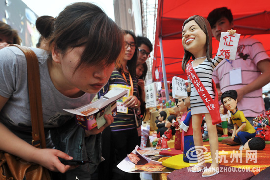 “姐我非清华北大博士不嫁!”今天,“凤姐”“举”着她的征婚誓言来到了第六届中国国际动漫节上。顶着当空的烈日,逆着拥挤的人流,记者在“酷卖街·创意市集”找到了她。当然了,她并不是真的来到了市集,而是有人为她捏了泥人,还配上了经典的话语,看的人围了里外三层,大家自觉地拍摄留影、询价订购。