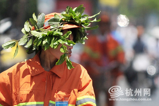 杭州网讯 今天上午,杭州的气温飙到34℃。马路上的气温更高,正午的太阳下,一位清洁工将树叶缚在帽子上,以摭挡烈日。