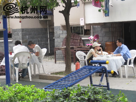 再进来的客人被引上二楼,这里晚上是棋牌室,白天就是饭桌。透过一个略显隐蔽的小门,小区的林荫道上竟也有几桌正在点餐的客人。