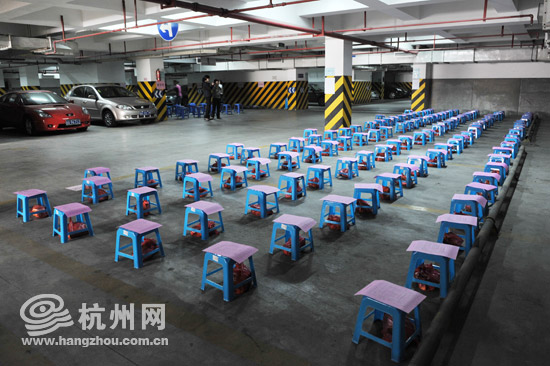 演习开始前,地下车库内已准备好凳子和急救知识宣传页。