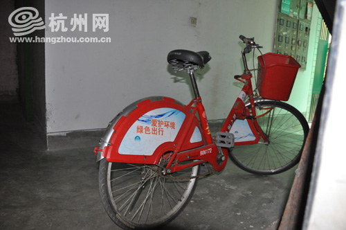 今天下午,网友江先生向杭州网热线QQ200900571反映说,文晖路330号一幢居民楼内停着一辆公共自行车,已经停了5天了。