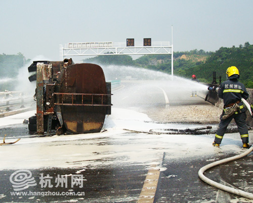 交警部门在第一时间对杭瑞高速的老余杭入口、留下入口和临安青山湖入口进行了封锁,杭州市公安消防局先后出动了余杭、留下、西湖、祥符、蒋村等五个消防中队13辆消防车前往现场扑救。9点50分左右,火势被成功控制。两个小时后,大火被完全扑灭。