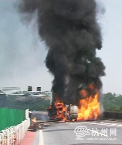 杭州网讯 今天上午9时许,杭瑞高速(原杭徽高速)余杭镇路段高架,一辆槽罐车因受撞后侧翻在快车道,随即整车发生猛烈燃烧。大火历经两个小时才被扑灭。所幸事故中两名驾驶员脱离火场,未造成人员伤亡。