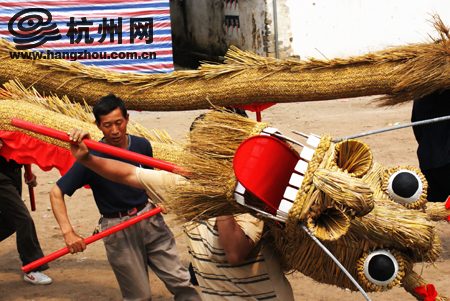 艺人们把稻草对半拧成一小把一小把,然后把这些草把,按照龙头的摸样用草绳边叠边绑。