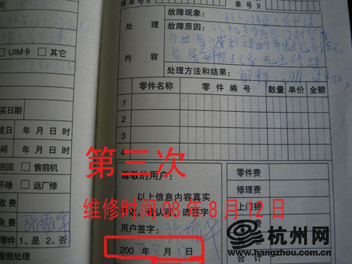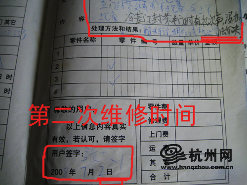 张阿姨拿出三张维修记录,登记维修都是保内,杭网记者又来到位于庆春路上的LG维修部,维修部的工作人员调出张阿姨的电脑维修记录后,记者发现了问题。电脑记录的维修时间和维修人员上门维修时填写的一致,可是冰箱保修时间却被填写成了保外。但是对冰箱的说明都是正常。冰箱出现“流汗”现象,维修人员清楚的填写为密封管泄漏,确又被解释为正常。难道LG冰箱不“流汗”才不正常了吗?“流汗”的冰箱才正常吗?