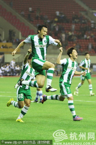 杭州绿城出场阵容:1-韩锋;20-荣昊、5-杜威、3-吴伟超、15-孙吉;33-汪嵩、8-李彦、19-唐家庶、7-谢志宇;9-拉米雷斯、32-巴力
